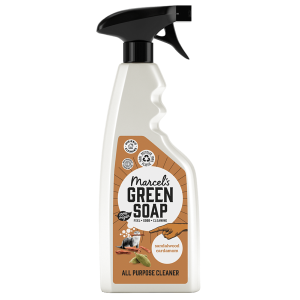 Sandalwood & Cardamom All Purpose spray, for a quick cleanup in between, based on herbal soap. Like all Marcel’s Green Soap products, our All Purpose Spray contains no coloring agents, parabens, phosphates, chlorine, ammonia or acids. Full of natural ingredients.