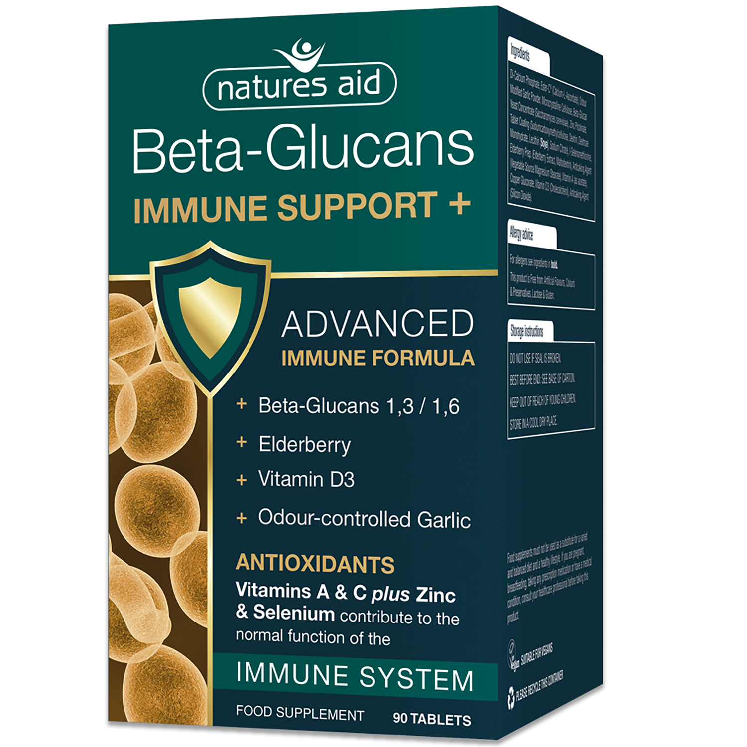 Natures Aid® Beta-Glucans Immune Support + is an advanced formula to help support the body’s Immune System. Vitamin A, Vitamin D, Vitamin C, Zinc, Copper and Selenium contribute to the normal function of the immune system.