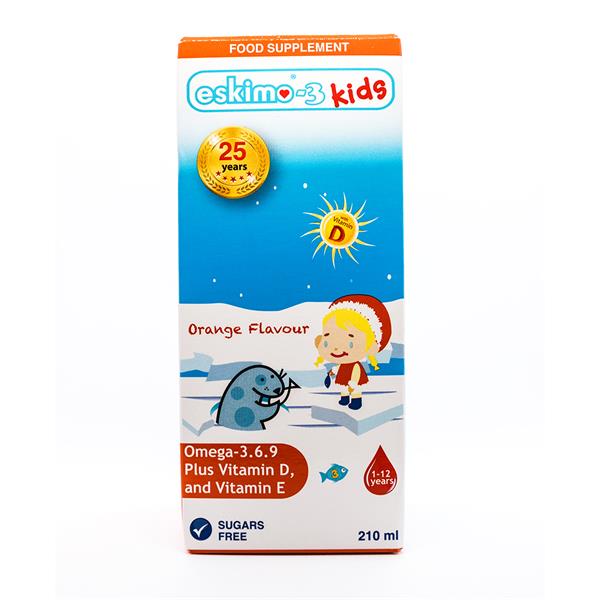 Because a child’s brain and nervous system has different fatty acid requirements whilst it is growing, Eskimo Kids reflects these needs with a balance of Omega-3, Omega-6 and Omega-9 fatty acids, which provide the “building blocks” essential to growth and development. Eskimo Kids contains antioxidants to protect its stability, and it comes in a natural orange flavour that kids will love.