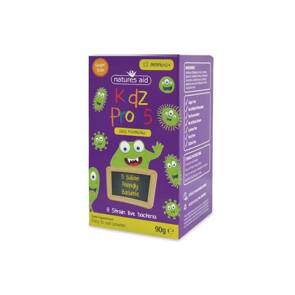 Natures Aid® Kidz Pro-5 children’s daily microbiotic supplement contains a guaranteed 5 billion live organisms, using 8 extensively researched strains of bacteria: Bifidobacterium lactis, Lactobacillus plantarum, Lactobacillus rhamnosus, Streptococcus thermophilus, Lactobacillus casei, Lactobacillus acidophilus sensu stricto, Bifidobacterium infantis, Lactobacillus reuteri.