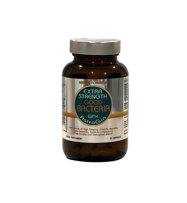 Extra strength probiotic with Astragin and l-glutamine in a 60 capsule bottle.