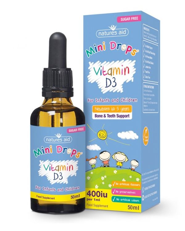 Natures Aid vitamin D3 400iu (10ug) mini drops 50ml is rich in calcium which is important for the development of healthy bones and teeth. These award winning drops provide 400iu of Vitamin D3 per 1ml which contributes to the normal function of the immune system, and supports normal bones, teeth and muscle function.